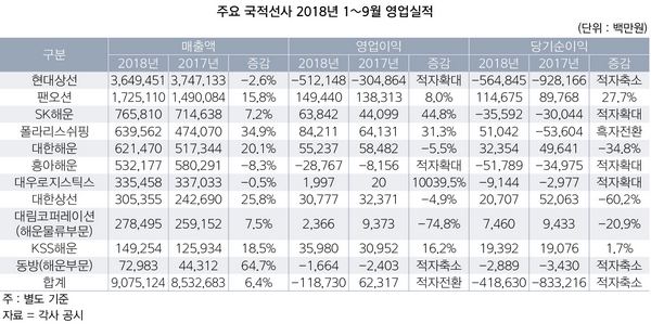 영업이익 흑자를 거둔 선사는 팬오션 SK해운 폴라리스쉬핑 대한해운 대우로지스틱스 대한상선 대림코퍼레이션 KSS해운이었다. 이 가운데 SK해운과 대우로지스틱스는 높은 이자비용으로 순이익에선 적자를 냈다. 11개사의 영업이익 합계는 -1187억원으로, 지난해의 623억원에서 적자 전환했다. 현대상선의 적자 폭이 68% 증가하면서 전체 합계에 영향을 미쳤다.