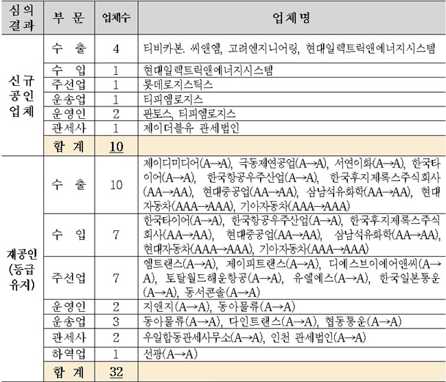 유엘에스 동서콘솔 현대중공업 한국일본통운 토탈월드해운항공 동아물류 선광 디에스브이에어앤씨 앰트랜스 협동통운 등 32개 업체도 재공인됐다.