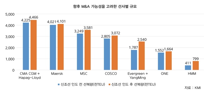 세계 4~5위인 CMA-CGM과 하파크로이트의 M&A가 이뤄지면 통합 선복량은 422만TEU로, 400만TEU를 웃돌고 있는 세계 1위 머스크라인의 아성을 넘어서게 된다. 양밍을 인수할 경우 에버그린 역시 178만TEU의 선복량을 기록, 머스크라인 MSC 코스코 CMA-CGM에 이어 세계 5대 선사로 등극하게 된다.