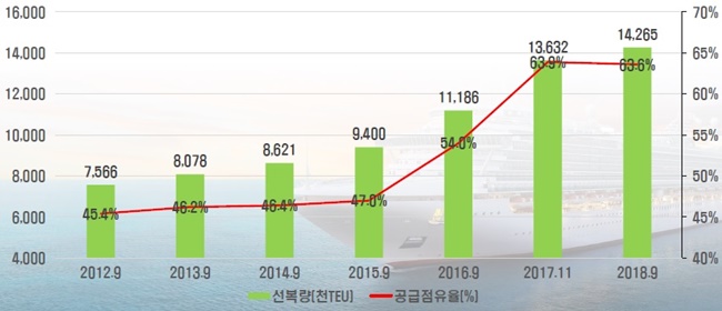 | ▲ 세계 5대 선사의 시장점유율 추이(자료 : KMI, 알파라이너) |
