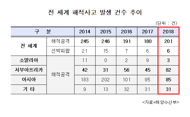 해양수산부에 따르면 2018년 한 해 전 세계에서 발생한 해적사고는 201건으로, 2017년의 180건에 견줘 12% 증가했다.