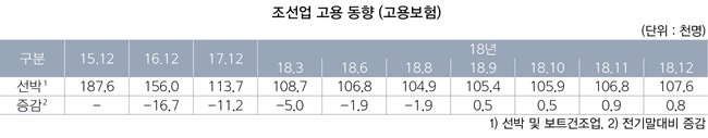 고용은 2016년 1월 이후 지속적으로 감소했으나, 지난해 9월 이후 상승반전하며 9월 이후 4개월간 총 2700명이 증가했다. 2018년 말 기준 고용은 10만7000명 수준을 회복했으며, 올해도 일감 증가에 따라 상승세를 보일 것으로 산자부는 전망했다.