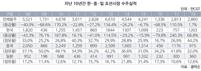 산업통상자원부와 영국 클락슨에 따르면 지난해 우리나라는 전 세계 선박 발주량 2860만CGT(수정환산톤수) 중 1263만CGT를 수주, 중국조선을 제치고 국가별 순위에서 1위를 꿰찼다.