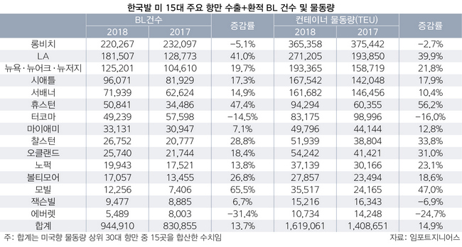 특히 휴스턴은 지난해 56.2% 폭증한 9만4000TEU를 기록해 가장 성장률이 높았다. 모빌도 3만6000TEU를 기록해 2017년 2만4000TEU 대비 47% 급증했다. 그 외 뉴욕·뉴어크·뉴저지 19만3000TEU, 시애틀 16만8000TEU, 서배너 16만2000TEU, 찰스턴 5만2000TEU, 노퍽 3만7000TEU, 볼티모어 2만8000TEU 등으로 나타났다.