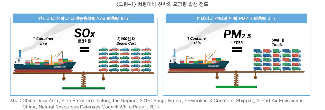 세계 주요 연구기관은 항만 혹은 선박이 발생시키는 대기오염에 대한 연구를 진행하고 있다. 중국의 China Daily Asia 등의 자료를 인용하면 고유황유 사용 선박 1척이 발생시키는 SOx, NOx 등의 대기오염 물질이 트럭 50만대 분량과 같다고 발표했다(<그림-1> 참조). 선박 크기와 항행 속도, 노후 정도 등에 따라 차이는 있겠으나 그 정도가 엄청나서 선박의 대기오염 수준은 다른 교통물류수단과 비교해서 타의추종을 불허한다. 또한 우리가 일반적으로 알고 있듯이 것처럼 차량을 공회전 시킬 때 매연발생량이 훨씬 많은 것처럼 항만에 접안한 선박이 입출항시와 자체 전력 확보를 위해 엔진을 가동시킬 때우 발생하는 매연은 항행시보다 훨씬 높을 것이라 추정할 수 있을 것이다.