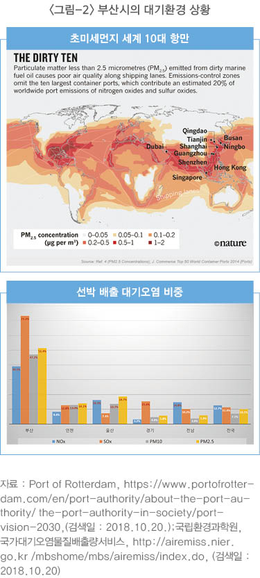 결국 이러한 대기오염물질은 항만배후에 거주하는 도시민들의 건강을 해치는 심각한 원인이 되는 것이다. 그런데 왜 특히 선박에서 발생되는 대기오염물질의 양이 많은지는 선박에서 사용되는 연료에서 찾을 수 있다. 일반적으로 선박이 사용하는 연료인 벙커C유는 원유를 정제하고 남은 가장 마지막 물질인 피치(피치는 포장재인 아스팔트 원료)보다 조금 상위 제품이다. 당연히 이러한 저급 연료를 사용하게 되면 다량의 대기오염물질을 발생시킬 수밖에 없고 이는 국민들의 건강에 치명적인 영향을 미치게 될 수 밖에 없는 것이다. 물론 이러한 저급 연료를 사용하는 이유는 경제적인 요인 때문이다. 우리나라 수출입 화물의 99.6%, 전 세계 화물의 80~90%가 해운을 이용하는 이유는 대량 화물을 저렴하게 운송할 수 있기 때문이고 그 이면에는 싼 연료가 큰 역할을 하고 있다. 얼마 전 독일의 한 연구기관에서 발표한 내용에 따르면 세계 최대의 오염된 항만(Global dirty 10) 중 부산항이 포함돼 있었다(<그림-2> 참조). 아마도 부산시민들이 보면 깜짝 놀라는 결과이지만 세계에서 가장 큰 항만들, 즉 선박이 가장 많이 오고가는 항만들이 가장 오염된 항만이라는 상식적인 결과에 기인한 내용이다.
