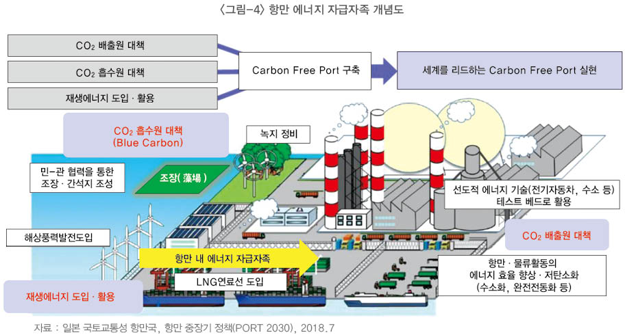 마지막은 항만 혹은 항만도시 자체에 에너지 순환률 100%의 친환경 에너지 생태계를 구축하는 것이다. 항만도시 혹은 항만에서 소비되는 에너지 전체를 바다와 연안이라는 공간을 활용해 해상풍력, 태양광, 조력 등을 통해 생산해 자급자족할 수 있는 생태계를 구축하는 것이다. 이렇게 되면 화석연료나 원자력을 통해 생산된 전기에너지의 공급 없이 자체적으로 에너지를 생성하고 소비하며, 에너지 소비로 인해 발생되는 환경오염을 최소화할 수 있을 것이다(<그림-4> 참조). 아마도 이러한 항만 에너지 체계가 구축될 경우 우리가 생각하는 맑고 깨끗한 항만과 바다가 다시 우리에게 돌아 올 수 있을 것이다.