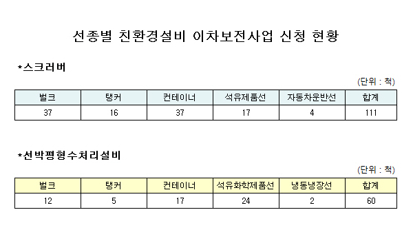 신청 선박을 선종별로 보면 스크러버는 컨테이너선 37척, 벌크선 37척, 탱크선 16척, 석유제품운반선 17척, 자동차운반선 4척이고, 평형수처리장치는 컨테이너선 17척, 벌크선 12척, 탱크선 5척, 석유화학제품운반선 24척, 냉동냉장선 2척이다.