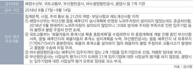 부산항과 광양항의 항만 배후단지 관리 실태를 감사한 결과 총 21건의 위법·부당사항이 있었던 것으로 확인됐다. 감사원은 지난 7일 해양수산부 등 7개 관련 기관들의 부산·광양항의 배후단지 관리 실태를 점검한 결과를 발표했다. 지난해 8월27일부터 보름 정도 진행된 감사에서 부산항만공사(BPA)와 광양항만공사(YGPA) 소관의 관리 소홀 사항 6건이 적발됐다.