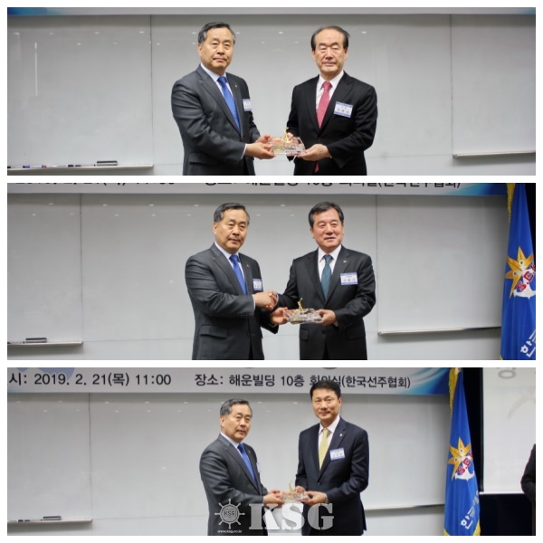 | ▲ 선주협회 정태순 회장(첫 번째 사진), 흥아해운 이환구 상임고문(두 번째 사진), 장금상선 금창원 부사장이 해양소년단연맹 정호섭 총재로부터 위촉패를 받고 기념촬영을 하고 있다. |