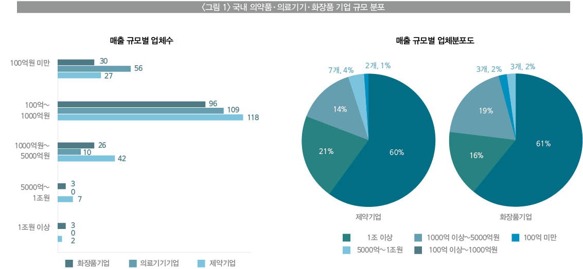 조사에 따르면, 의료기기 국내 제조 현황은 여전히 중소기업이 다수를 차지하고 있으며, 글로벌 상위 기업에 비해서는 연구개발 투자액 등이 절대적으로 부족한 것을 알 수 있다. 국내 의료기기 기업의 매출 현황(그림1)을 살펴보면 100억원 미만이 56개이고, 100억원 이상 1000억원 미만은 109개, 1000억원 이상이 10개로 조사됐다.