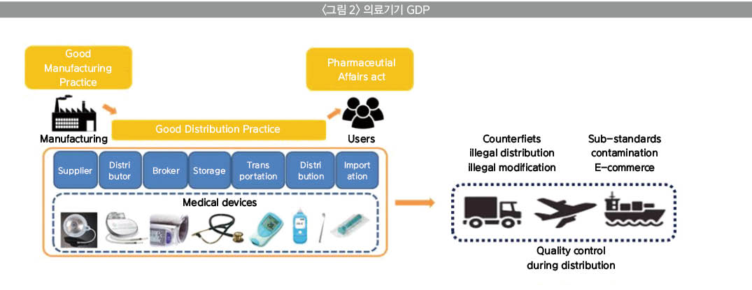 GDP는 GMP(Good Manufacturing Practice: 우수제조관리) 이후 물류 및 유통단계로 공급망의 안정과 신뢰, 효율적 운용을 위한 관리표준으로 유럽·미주 선진국에서 처음 도입됐으며, 특히 의료기기분야에서 중요하게 인식되고 있다. (그림 2)
