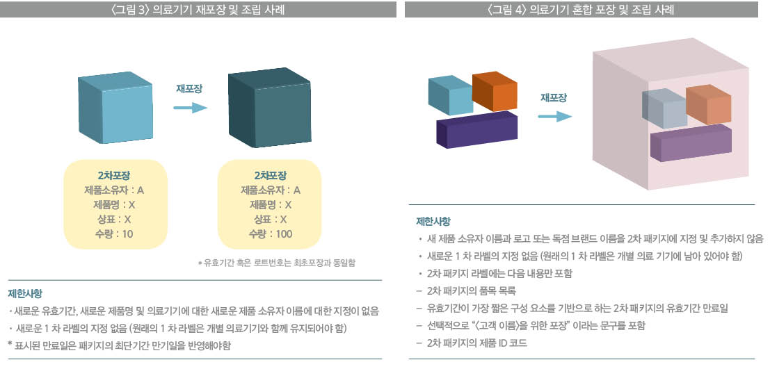 의료기기를 국내외로 유통할 경우 단위포장에서 집합포장으로 할 경우 재포장과정에 사용되는 모든 기능과 문서는 최초포장과 동일한 사양을 사용해야 하며 단지 수량변경만 가능하도록 해야 한다. (그림 3) 또한, 다른 의료기기기와 함께 포장하고 조립 할 경우 의료기기간 이물질 혼입과 오남용을 방지할 수 있도록 2차포장에 대한 명확한 기준이 설정돼야 한다. (그림 4)