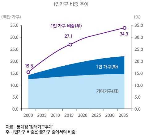 가구구조가 변화하고 있다. 국내 1인가구는 1990년 101만 가구에서 2000년 226만 가구, 2015년 506만 가구로 급증했다. 2019년에는 572만 가구로 증가하고, 2035년에는 763만 가구에 달할 것으로 전망된다. 1인가구가 빠르게 증가하면서, 1인가구 비중이 가파른 상승세를 지속하고 있다. 전체 가구에서 1인가구가 차지하는 비중은 1990년 9.0%에서 2015년 26.5%로 급속히 확대됐다. 2019년에는 29.1%에 이를 전망이고, 2035년에는 34.3%에 이를 것으로 예측되고 있다. 고령화, 저출산, 이혼 및 동거의 증가, 혼인 연령 상승 등은 향후 1인가구의 확대 추세를 가속화시키는 데 주요 견인차 역할을 할 것으로 예상된다. 이러한 가운데, 1인가구와 함께 아예 결혼을 하지 않거나, 결혼을 한 부부라고 하더라도 자녀를 갖지 않는 부부(딩크족)가 늘면서 2인가구도 빠르게 증가할 것으로 전망되고 있다.
