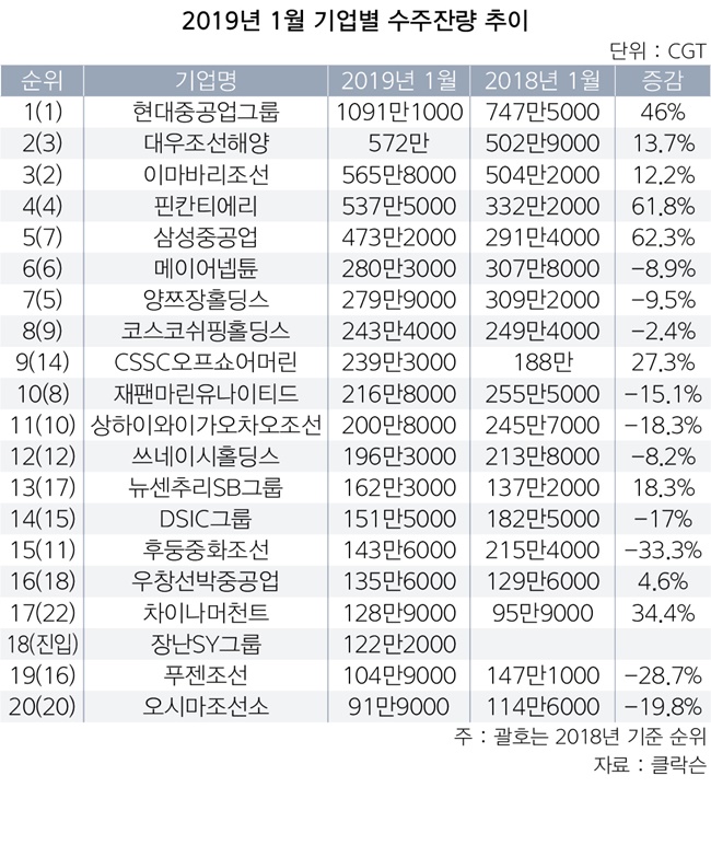 2019년 1월 말 전 세계 20대 조선사 중에서 1년 전과 비교해 일감이 늘어난 곳은 9곳으로 파악됐다.