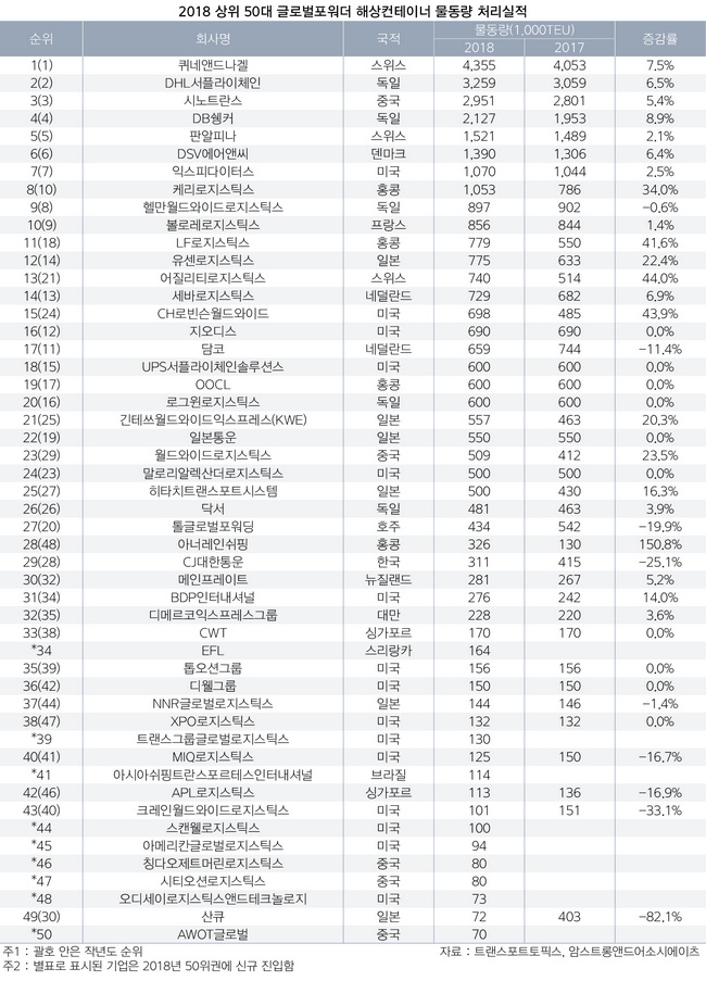 해상부문을 놓고 보면 상위 10대 포워더 중 유럽계 7곳이 장악했다. 1위 퀴네앤드나겔은 지난해 435만5000TEU를 운송하며 2위 DHL서플라이체인(325만9000TEU)을 압도적인 격차로 이겼다. 독일 DB쉥커는 212만7000TEU를 수송하며 4위에 이름을 올렸다. 5위는 152만1000TEU를 수송한 스위스계 포워더 판알피나에게 돌아갔다.