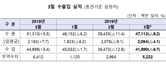 우리나라의 3월 전체 수출입 실적은 하락세를 면치 못했다. 수출은 전년 동기 대비 8.2% 감소한 471억1000만달러(약 53조5400억원)를, 수입은 6.7% 뒷걸음질 친 418억9000만달러(약 47조6000억원)를 기록했다. 무역수지는 52억2000만달러로 86개월 연속 흑자를 이어갔다.