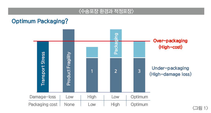제품/포장시스템 설계에 일반적인 개념은 <그림1>로 설명할 수 있다. 기존의 경우에 있어 적정포장은 제품자체의 내구성과 수송중의 물류환경(Transport Stress)에서 발생 할 수 있는 손상과 이를 보호 할 수 있는 포장시스템으로 구성된다. 그림의 경우 수송강도는 제품의 파손성(Fragility)과 포장의 관계로 표현된다. 즉 파손에 취약한 제품과 포장비용에 대한 정량화에 대한 상관관계는 명확하게 설명이 된다.