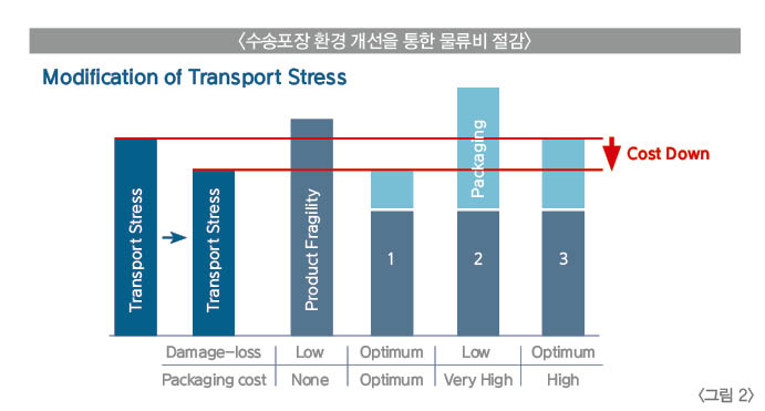<그림2>에서처럼, 동일한 제품의 경우 제품의 안전성을 높이기 위해 제품과 포장재 설계 기준을 개선 변경보다는 수송환경을 개선하게 되면 기존 포장재 사용을 줄임으로서 전체 물류비를 절감 할 수 있다.