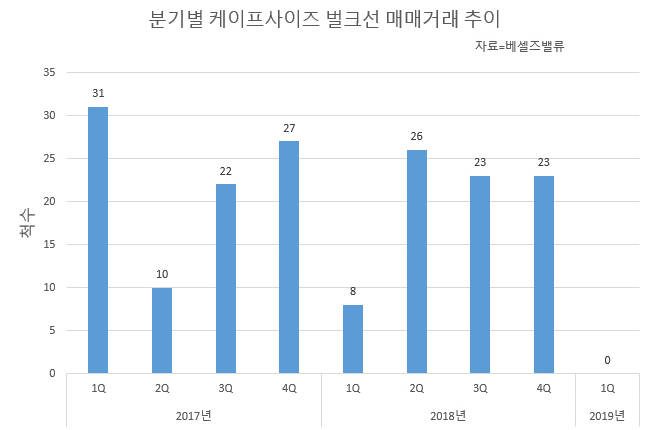 케이프사이즈 벌크선 매매는 지난 2년간 높은 수준을 유지했다. 2017년 90척 지난해 80척이 각각 거래됐다. 1분기만 놓고 보면 2017년엔 31척, 지난해는 8척이 거래됐다.