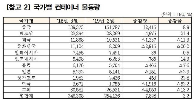 국가별로 가장 많은 물동량을 자랑하는 중국은 15만2000TEU로 전년 동월 대비 8.9% 증가했고, 2위 베트남은 2만8000TEU로 21.4% 급증했다. 반대로 미국과의 교역량은 52.2% 급감한 2000TEU, 대만은 26.2% 감소한 8200TEU에 머물렀다.