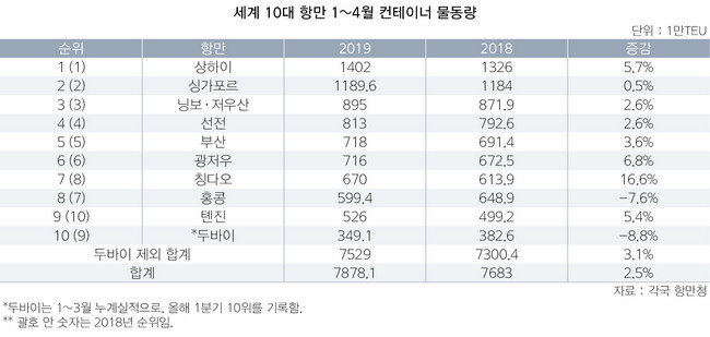 1위 상하이항은 1~4월 1402만TEU를 취급해 5.7%의 성장률을 기록했다. 2위 싱가포르항은 전년과 비슷한 수준인 1189만6000TEU를 처리했다. 3위 닝보·저우산항은 같은 기간 2.6% 성장한 895만TEU를 기록했다. 뒤이어 선전항은 2.6% 증가한 813만TEU를 취급해 4위에 이름을 올렸다. 지난 1~3월 아슬아슬하게 5위 자리를 유지한 부산항은 1~4월 누계 실적에서도 6위 광저우를 단 2만TEU 차이로 꺾어 위태로운 외줄타기를 이어갔다.