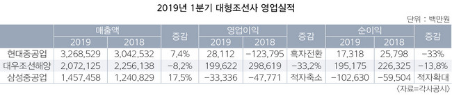 영업 성적표는 현대중공업은 조선부문 수익성 개선과 해양부문 보수충당금 환입으로 영업이익 흑자를 거뒀으며, 삼성중공업 역시 고정비 영향이 줄어들며 영업손실 폭을 줄였다. 반면 대우조선해양은 건조선가 하락 등으로 외형과 이익이 동반하락했다. 현대중공업은 올해 1분기 281억원의 영업이익을 기록하며 흑자전환에 성공했다. 순이익은 173억원을 기록, 전년 258억원에서 33% 후퇴한 실적을 거뒀다.