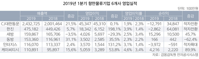 업계 1위 CJ대한통운은 올 1분기 매출액 2조4327억원, 영업이익 453억원을 거둬 각각 21.5% 0.1%의 증가율을 기록했다. 부문별로 계약물류(CL)는 매출액 6809억원, 영업이익 257억원을 기록해 각각 3.1% 14.5%의 성장세를 거뒀다. 반면 택배와 포워딩사업은 매출 증가에도 영업이익이 크게 감소했다.