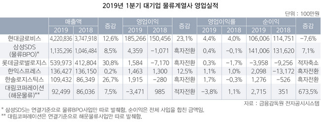 뒤이어 삼성SDS(물류BPO 부문)는 같은 기간 매출액 1조1353억원을 달성해 전년 동기 대비 8.5% 성장했다. 이 회사의 전체 매출액(2조5025억원) 대비 물류사업의 비중은 45.4%로 지난해보다 1%p 증가했다. 이 부문 영업이익은 -11억원에서 44억원으로 흑자전환에 성공했으며 영업이익률도 0.4%를 기록했다.