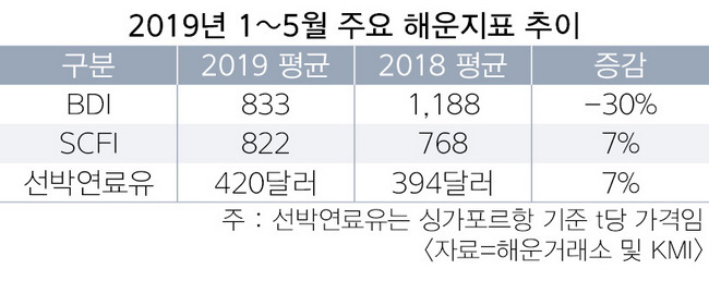 올해 벌크선 운임은 큰 폭으로 고꾸라졌다. 1~5월 평균 벌크선운임지수(BDI)는 833으로, 지난해 같은 기간의 1188에 비해 30% 하락했다. 1년 전 이맘때 19%의 상승세를 띠었던 벌크선 시장은 올해 들어선 1월 말 발생한 브라질 발레 광산댐 붕괴사고의 후유증으로 약세 시황을 면치 못했다. 케이프사이즈 평균운임이 지난해 1만3413달러에서 올해 8559달러로 36% 급락했고 파나막스와 수프라막스 운임도 각각 27~30% 떨어졌다.