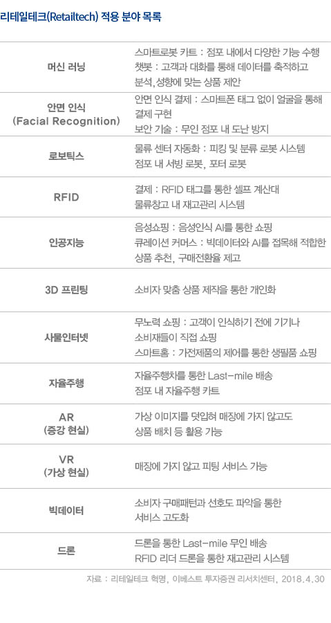 빅데이터 분석과 AI의 딥러닝 기술을 활용해 고객이 다음에 구매할 제품을 검색 및 추천하는 일은 이제 일상이 됐고 점포의 입지 선정부터 매출과 배송 예측, 재고관리 및 자동결제까지 소비자 구매 경로의 모든 과정에 AI가 관여하고 있다. 또한 ‘펀슈머’라는 재미(fun)와 고객(consumer)의 합성어가 등장 할 만큼 상품 구매를 넘어 재미와 즐거움을 추구하는 고객들을 사로잡기 위해 VR, AR을 활용한 디지털 매장화, 가상쇼핑몰이 증가하고 있다. 이 외에도 터치리스(Touchless)방식의 결제 시스템, 안면인식, 무선주파수(RFID), 3D프린트, IoT, 드론 등을 활용한 리테일 테크 적용 분야와 활용 가능성은 무궁무진하다고 할 수 있다.