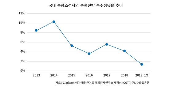 국내 중형조선사들의 세계시장 수주점유율도 크게 하락했다. 2014년 10%를 웃돌았던 조선사들의 중형선박 수주점유율은 지난해 4%대로 하락한 데 이어 올해 1.4%로 곤두박질 쳤다. 국내 조선업에서 차지하는 수주액 비중도 2.9%로 2018년 4.5%에 비해 하락했다.