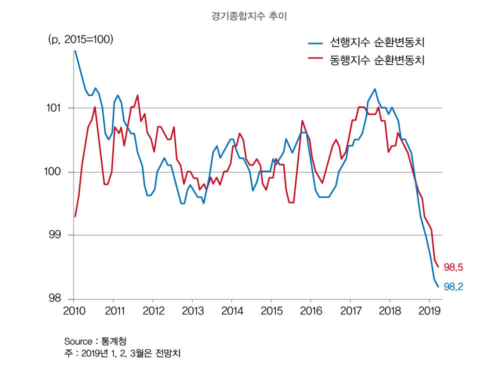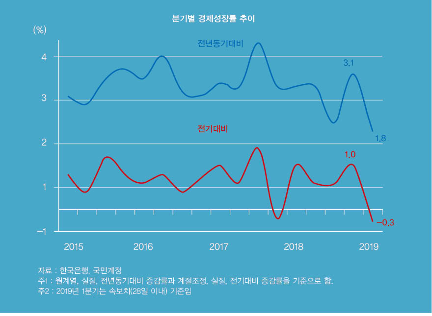 얼마 전 한국은행이 발표한 2019년 1분기 경제성장률(속보치)이 최악의 모습을 보였다. 전기대비 경제성장률은 -0.3%를 기록하며, 한국경제가 2018년 4분기보다 후퇴했음을 알렸다. 전년동기대비 기준으로 보아도, 2019년 1분기 경제성장률은 1.8%를 기록하며 근래 들어 가장 낮은 수준을 보였다.