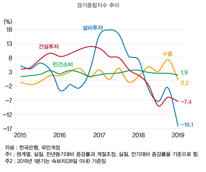 한 학급의 평균성적이 80점이라고 한다면, 어떤 학생들은 80점 이상의 공부를 잘 하는 아이들이겠지만 어떤 학생들은 80점 이하에 머물러 소위 ‘평균을 깎아 먹는’ 경우도 있는 법이다. 경제성장률도 마찬가지다. 경제성장률이 바닥수준의 1.8%를 기록했다면, 경제를 구성하는 부문 중 어떤 항목은 더욱 안 좋게 나타났을 것이다. 가장 안 좋은 부문은 단연 ‘투자’다. 건설투자와 설비투자가 5분기 연속 마이너스를 기록하고 있고, 특히 1분기 설비투자는 -16.1%를 기록했다. 대외적으로도 불안한 요소들이 많은 상황 하에서, 대내적으로도 구조적·경기적·정책적 하방압력들이 중첩되면서 기업들이 적극적으로 투자에 임하기를 주저하는 보습이다. 소득이 불안정해 지는 과정에서 민간소비도 완만하게 둔화돼 1분기 1.9%를 기록했다. 더욱이, 그동안 한국경제를 지탱해준 우등생 역할을 했던 수출마저 0.2%로 크게 둔화됐다. 반도체를 비롯한 주력 수출품목들이 글로벌 수요둔화와 원화강세 등의 여건 하에 고전을 면치 못하고 있다.