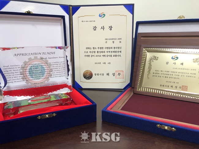지난 4일 창원시와 마산항 노동조합은 호그오토라이너스코리아가 마산항과 지역사회 발전에 기여한 공로를 높게 평가해 구정모 대표에게 감사패와 감사장을 수여했다.