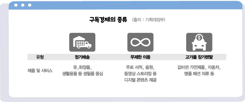 일상 속 빠르게 침투한 구독경제 서비스는 맥주, 와인, 과일과 채소, 가정간편식 등 식음료부터 자동차, 정수기, 침구세트, 의류, 꽃, 취미용 소품 등 그 범위가 매우 광범위하다. 주로 새로 시작하는 스타트업이 충성고객을 확보하기 위해 도전했지만 이들의 성공을 지켜본 대기업의 참여도 눈에 띄게 늘고 있다. 먼저 국내 스타트업 ‘밀리의 서재’는 월 9900원에 3만여 권의 전자책을 무제한 이용할 수 있는 서비스를 출시했다. 무거운 종이책을 들고 다니지 않아도 될 뿐만 아니라 종이책 한 권 가격에도 못 미치는 가격으로 다양한 전자책을 열람할 수 있다는 장점으로 서비스 2년 만에 가입자 수 70만 명을 넘겼다. 똑같은 일상에 색다른 기분 전환을 선사할 수 있는 꽃 정기배송 서비스도 인기다. 스타트업 ‘꾸까’는 월 약 3만원의 가격으로 2주일에 한 번씩 꽃 배송을 시작해 50억 이상의 매출을 올리고 있다. 대기업 CJ ENM 오쇼핑은 지난 5월부터 TV홈쇼핑 최초로 구독 서비스를 시작했으며 쿠팡은 현재 8000여개의 상품을 정기적으로 배송하고 있다. 현대 자동차는 월 72만원을 내면 주행거리의 제한 없이 3가지 차량 중 원하는 차량으로 매 월 최대 2회씩 교체해 탑승할 수 있는 서비스를 제공 중이다. 이베이 코리아, 티몬, 롯데홈쇼핑 등의 기업도 가입 즉시 현금처럼 사용할 수 있는 포인트와 상품권, 높은 적립금 및 무료배송과 같은 서비스를 제공하며 유료 회원제로 고객을 유치하는데 집중하고 있다.