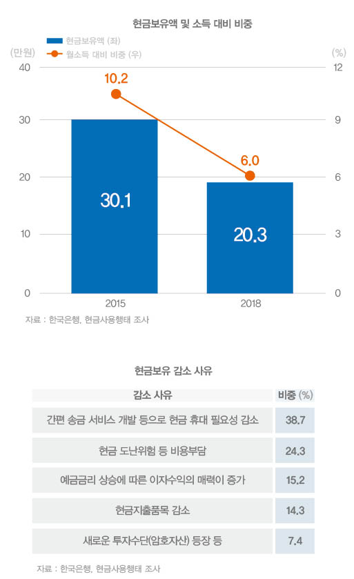 한국도 현금에 대한 의존도가 급격히 줄어들고 있다. 한국은행의 ‘현금사용행태 조사’에 따르면, 2015년 평균 현금보유액은 약 30.1만원에서 2018년 20.3만원으로 크게 감소했다. 더욱이, 월소득 대비 현금보유액이 차지하는 비중은 같은 기간 동안 10.2%에서 6.0%로 하락했다. 현금보유액이 감소하는 이유는 ‘간편 송금 서비스 개발’(38.7%)과 ‘현금 도난위험 등 비용부담’(24.3%) 등으로 나타났다. 시대가 거듭될수록 국민의 현금보유 성향이 줄어들 것으로 보인다.