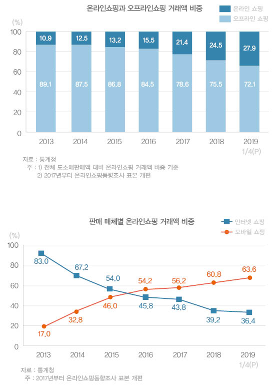 현금없는 사회로 진입할 시점이 가속화되고 있다. 그 중대한 배경에는 온라인 쇼핑이 있다. 2013년에는 전체 소매판매액에서 온라인쇼핑이 차지하는 비중이 10.9%였으나, 2019년 1분기에는 27.9%에 이른다. 온라인쇼핑에 대한 의존도가 상승할수록 현금을 사용하려야 할 수 없는 환경으로 진입하고 있는 것이다. 더욱이, 온라인쇼핑 거래액도 크게 PC 기반의 ‘인터넷쇼핑’과 휴대폰 기반의 ‘모바일쇼핑’으로 구분되는데, 이미 2015년에 역전돼 모바일쇼핑으로 이동하는 경향이 뚜렷하다. 2020년에 들어서는 70%수준에 달할 것으로 전망된다.