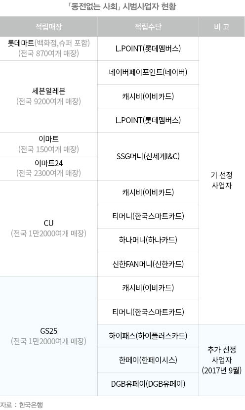 한국은행은 2020년까지 동전없는 사회 진입을 위한 비전을 세우고, 도입방안을 계획해 왔다. 거스름돈을 카드에 충전하거나 계좌에 입금해 주는 소액결제망을 구축하는 등 전자금융인프라를 확대하기 위한 노력이 가속될 것이다. 특히, 2017년 실시했던 동전없는 사회 시범사업을 통해, 편의점 등에서 현금 거래 후 남는 잔돈을 선불카드에 적립하는 방식을 고도화 하고 있다. 시범사업 운영상황을 종합평가해 잔돈적립의 효과를 검증하고, 업종 및 적립수단을 다양화하는 등 사업을 확대할 예정이다.