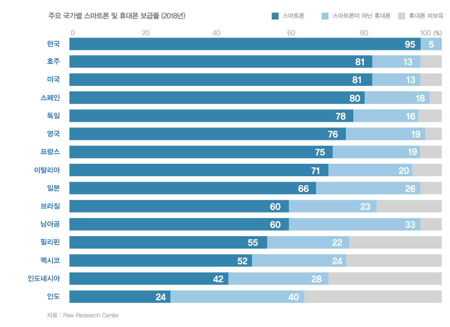 동전없는 사회에 진입하고, 점차 현금의존도가 낮아짐에 따라 지급결제산업에 대한 관심이 크게 부상하게 된다. 현금이 아닌 다른 지급결제방식으로 전환되기 때문이다. 특히 한국은 현금이나 카드를 소지하지 않아도 지급결제를 원활히 이행할 수 있는 환경이 마련돼 있다. 바로 스마트폰 보급률 때문이다. 한국은 스마트폰 보급률이 95%에 달한다. 호주(81%), 미국(81%), 일본(66%) 등과 비교해 현격히 높은 수준이다. 현금을 소지하지 않아도, 스마트폰을 소지하기 때문에 전자금융 인프라가 확보됐을 때 동전없는 사회로의 이행이 원활한 것이다.