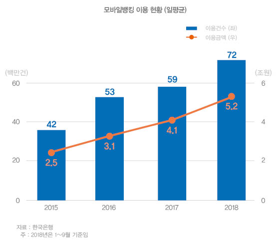 실제로 모바일 금융서비스 이용이 급격히 증가해 왔다. 모바일 금융서비스는 스마트폰 등 모바일 기기를 통해 제공되는 각종 금융서비스를 가리킨다. 모바일 금융서비스는 크게 은행 등 금융회사가 서비스 제공 채널을 모바일 기기로 확대한 서비스(모바일뱅킹)와 주로 비금융회사들이 제공하는 비대면방식의 서비스(간편송금, 간편결제 등)로 구분할 수 있다. 모바일뱅킹 이용건수와 이용금액은 급증해 왔다. 간편송금과 간편결제도 마찬가지다.