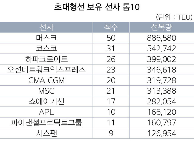현존선 기준으로 ULCV 선단 1위는 50척 88만6000TEU의 머스크다. 압도적인 1위에 이어 중국 코스코가 31척 54만2000TEU, 독일 하파크로이트가 26척 39만9000TEU로 각각 2~3위에 랭크돼 있다. 이 밖에 일본 오션네트워크익스프레스(ONE)가 23척 34만6000TEU, CMA CGM이 20척 31만9000TEU, MSC가 21척 31만3000TEU로 4~6위권을 형성하고 있다.