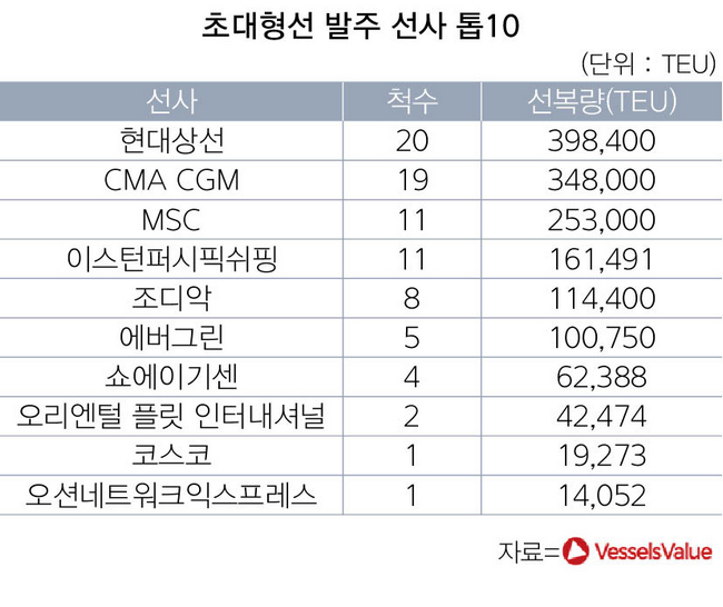 영국 해운조사기관인 베셀즈밸류에 따르면 현대상선은 초대형선 20척 39만8400TEU를 발주해 ULCV 발주량 1위에 올라있다. 2위는 19척 34만8000TEU를 발주한 프랑스 CMA CGM이 차지했다. 11척 25만3000TEU의 MSC가 뒤를 이었다. 올해 상반기까지 2만TEU급 컨테이너선을 모두 인도 받은 세계 1위 선사 덴마크 머스크는 내년 상반기까지 초대형선 발주를 보류한 상태다.