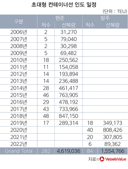 7월 현재 전 세계를 운항하는 초대형선 선복량은 282척 461만9000TEU, 신조 발주량은 84척 155만4000TEU다. 발주된 선박은 올해 하반기 18척 34만9000TEU, 내년 40척 80만8000TEU, 2021년 20척 30만7000TEU, 2022년 6척 8만9000TEU 순으로 인도될 예정이다. 발주된 선박들이 모두 인도될 경우 전 세계 UCLV 선대는 366척 617만3000TEU에 이를 전망이다.