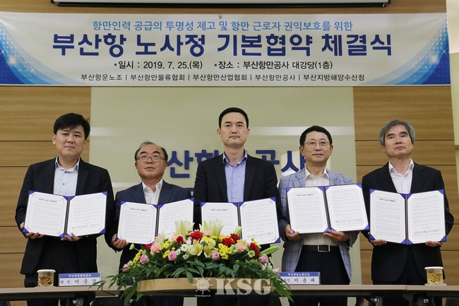 부산지방해양수산청은 부산항 항만인력 공급체계의 공정성과 투명성을 제고하고 항만근로자의 권익보호를 위해 25일 부산항만공사(BPA) 1층 대회의실에서 노사정 대표 간 기본협약을 체결했다고 밝혔다. 노사정 대표는 부산해수청 항운노조 BPA 항만물류협회 항만산업협회 등으로 구성돼 있다.
