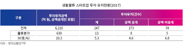새로운 기술을 접목한 생활물류 서비스는 대부분 스타트업이 먼저 시도하고 있다. 초기에는 주문음식 배달대행으로 시작하여 세탁물, 이사, 새벽배송 등 다양한 생활편의서비스를 제공하고 있으며 최근에는 IT기술이 발달하면서 앱, 사물인터넷(IoT), 빅데이터 등과 결합하고 있다. IoT 활용 기반의 생활물류 서비스는 서울 일부 지역을 중심으로 늘어나고 있는 무인보관함을 예시로 들 수 있다. 한국교통연구원의 조사에 따르면 생활물류 스타트업은 2015년도 40여개 기업에 불과했지만 2017년도에 118개사로 3배가량 성장했으며, 투자금액도 639억 원에 달한다.