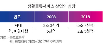 생활물류 서비스로 대표되는 택배와 퀵서비스산업의 성장도 지난 10년간 2배 이상 성장하고 있다. 국토교통부에 따르면 택배산업은 2008년 2조 3천억 원에서 2018년 5조 7천억 원으로 규모가 커졌고, 전국 서비스를 제공하는 16개 택배회사의 2018년 취급물량은 25억 4000개로 집계된다. 이는 쿠팡 등 쇼셜 직배송, 배달앱, 신선식품 등의 직배송 물량을 제외한 것으로 국민 1인당 택배 50개를 넘어 성인기준 1주일에 2건의 상품을 택배로 받고 있는 것이다. 국내 택배산업은 온라인쇼핑, 홈쇼핑 등의 증가에 따라 폭발적으로 성장하고 있으며 서비스 형태 또한 반일배송, 새벽배송, 주말배송 등 다양하다. 또한 어플리케이션, IoT, 드론 등 첨단기술의 접목이 꾸준히 이루어지고 있다.