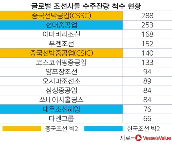 중국조선 빅2의 수주잔량 척수는 현대중공업과 대우조선해양을 합친 규모를 크게 뛰어넘는다. CSSC와 CSIC의 일감은 각각 288척 140척으로, 총 428척에 달한다.