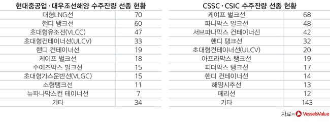 이어 핸디사이즈 탱크선 60척, VLCC 47척, ULCV 33척 등이 현대중공업과 대우조선해양 수주장부에 기입돼 있는 선박들이다. 중국 조선사와 비교해 건조 단가가 높은 LNG선이 압도적으로 많고 VLCC ULCV 등 고부가가치 선종 척수에서도 우위를 보이고 있다. 현재 LNG선과 컨테이너선(1만3000~1만4000TEU)은 각각 1억8550만달러와 1억1150만달러, VLCC는 9250만달러의 건조 단가를 기록 중이다.