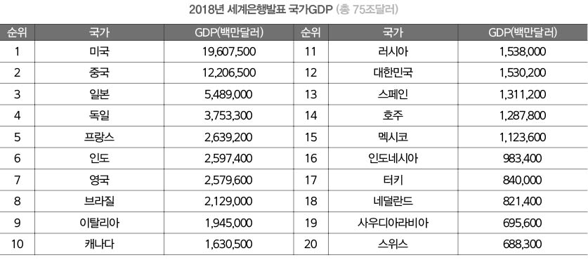 세계은행이 발표한 국가별 총 GDP를 보면 75조달러 규모이고, 그중에서 미국이 약 20조달러로 가장 높은편이다. 이어 중국이 12.2조달러 일본이 5.4조달러 이상이고 유럽연합이 총18조달러를 차지하고 한국은 1.5조달러로 12위를 차지하고 있다.